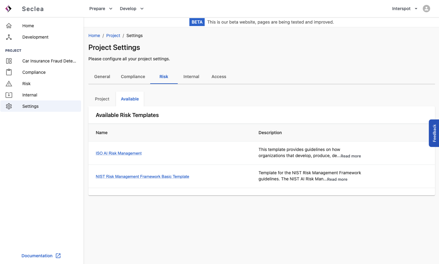 Setting up risk management monitoring for an AI project on the Seclea Platform is essential for identifying, assessing, and mitigating potential risks associated with your AI project. Follow these steps to set up risk management monitoring: